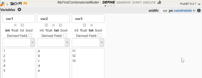 The first step is to define all of the variables and set the domain values for each variable. This is done in DEFINE tab: