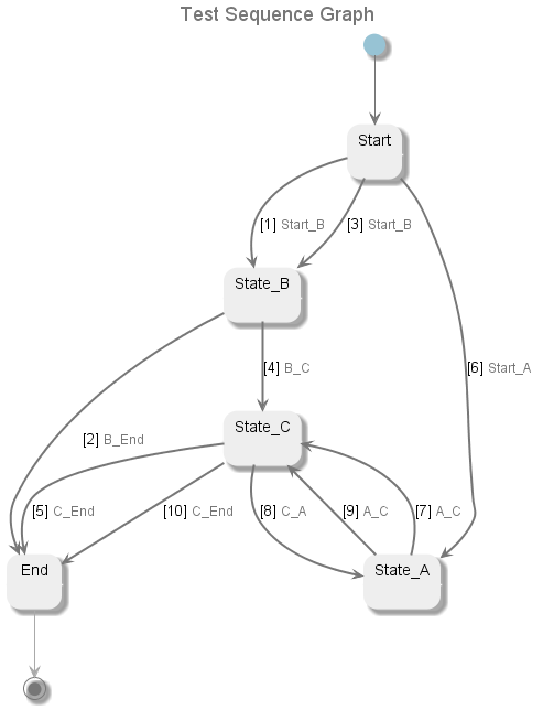 When model is completed, we are ready to generate test cases from it. Test cases are generated by traversing the states and transitions to achieve the desired coverage using algorithms, aka model sequencers.